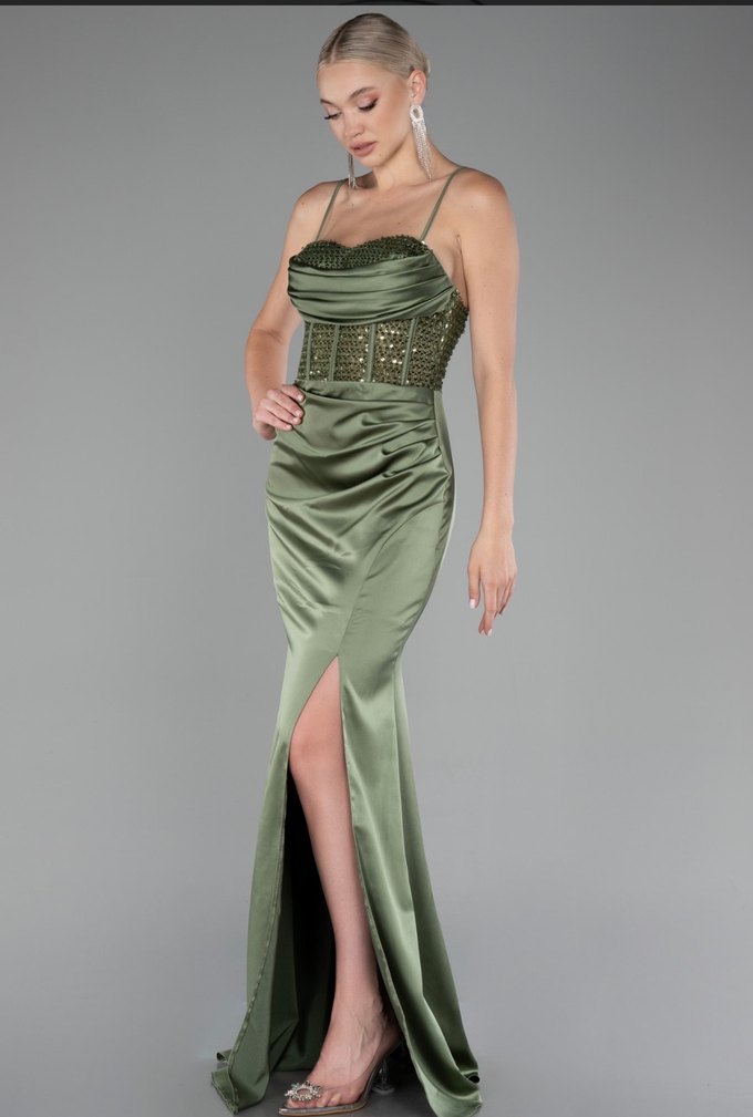 Haki Üstü Pullu Balen Korse Yırtmaçlı Uzun Saten Abiye 160 boy 10 cm topuklu ayakkabı ile giyilmiştir ona göre boyu kesilmiştir