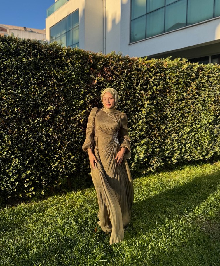 Haki renkli, uzun ve drapeli tasarıma sahip bu abiye, yüksek yakalı ve uzun kolludur. Modest ve regular fit kesimi ile düğünler için uygundur. Bohem ve avant-garde tarzda şık bir seçimdir. Bir kere kullanıldı şal ile birlikte gönderilecektir