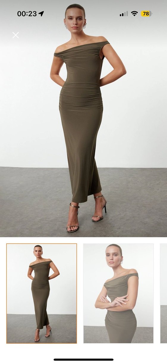 Haki renkte, uzun ve vücuda oturan bu elbise, kayık yaka ve drapeli tasarıma sahiptir. Askılı kolludur ve pürüzsüz sentetik kumaştan yapılmıştır.