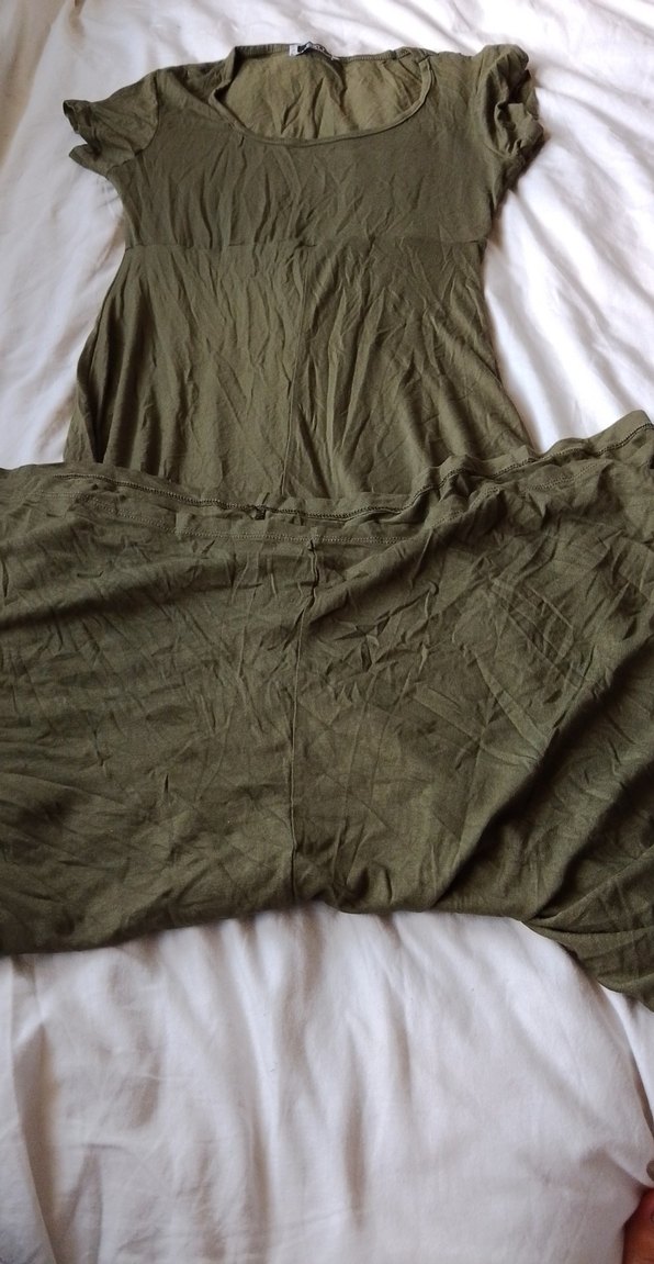Yumuşak keten kumaştan, drapeli, bol kesim, uzun haki elbisei, günlük kullanım için uygundur.