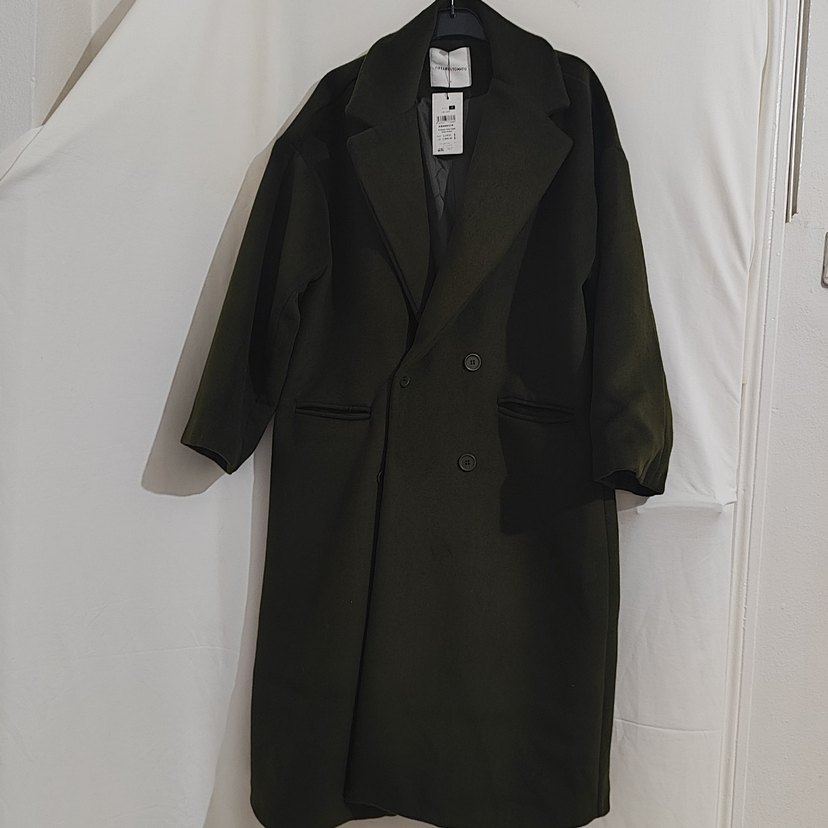 Çift düğmeli, klasik yakalı, cepli uzun Haki kaban. Sıcak ve yumuşak kumaştan üretilmiştir.