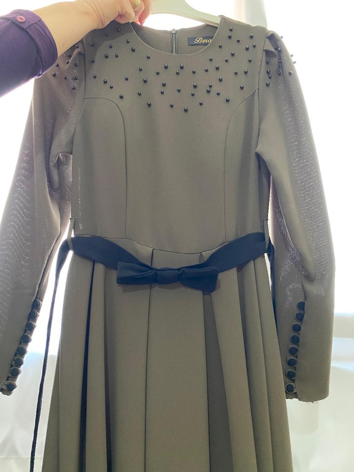 Bu oturan kesim uzun haki elbise, yakasında çıtçıtlı detaylar ve düğmeli askılı kollara sahiptir. Siyah kemeriyle şekillendirilmiş, özel günler için uygundur. ✨