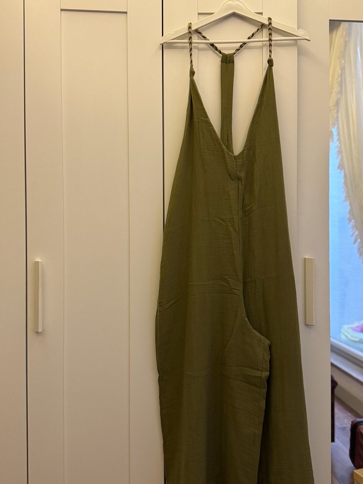 Alaçatıdan alındı. Hiç giyilmedi. Fiyatının yarısı. Haki renkte, keten kumaştan uzun, askılı ve straplez yaka tulum. Bol kesimi ve drapeli tasarımıyla bohem ve minimalist bir stil sunar.