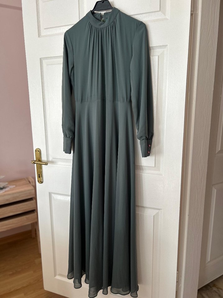Haki renkte, yüksek yakalı, uzun kollu ve drapeli tasarıma sahip uzun elbise. Minik minik bir iki tane lekesi var. Yıkayınca çıkacaktır. Bu yüzden fiyatı uygun tutuyorum.
