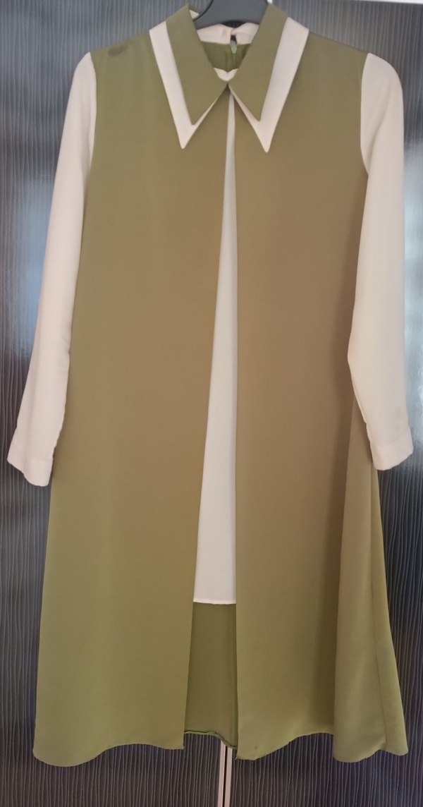 Haki renkte, uzun kesim ve kolsuz tasarıma sahip kadın tunik. Notlu yaka ve drapeli sentetik kumaşıyla minimalist ve çağdaş bir görünüm sunar. Ofis için uygundur.