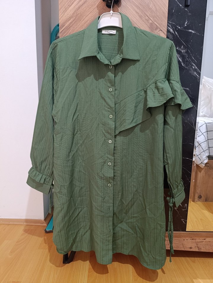 Haki renkli, uzun kollu ve düğmeli keten gömlek. Salaş kesimi ve yakasıyla günlük rahat sokak stiline uygundur. ✨