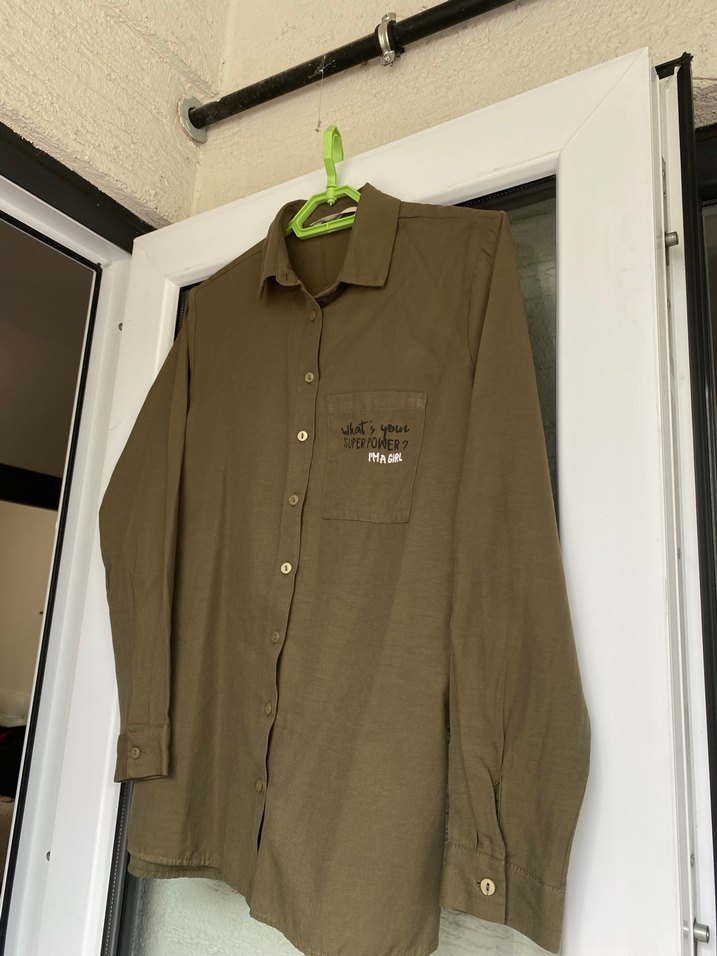 Haki renkli, uzun kollu keten gömlek. Düğmeli ve yakası notched lapel. Salaş kesim ve midi boyda, günlük rahat kullanım için uygun.