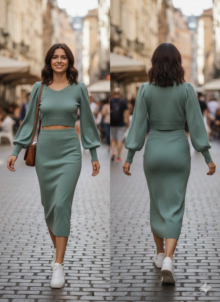 Haki uzun kollu, ince triko elbise, vücuda oturan kesimi ve yuvarlak yakasıyla günlük sokak modasına uygun, pastel tonlarda rahat bir şıklık sunar.
