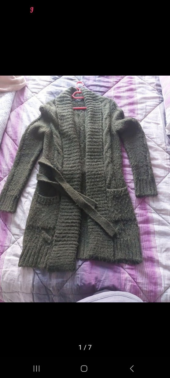 haki uzun kollu, örgü dokulu, bol kesim tarzda kadın hırka. Notch yakalı, kemerli ve cepli, günlük kullanıma uygun.