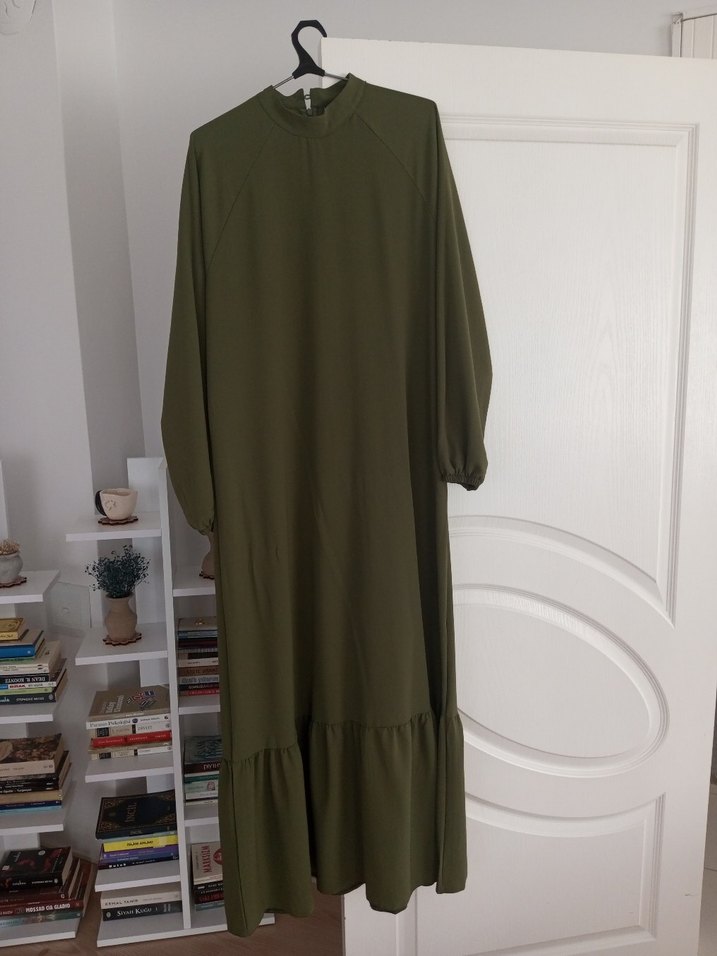 Haki renkte, uzun kollu, salaş kesim ve drapeli detaylara sahip kadın elbisesi. Yumuşak sentetik kumaştan günlük kullanım için uygundur.