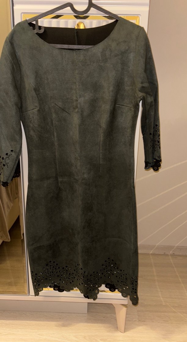 Haki Uzun Kollu Süet Kadın Ofis Elbisesi