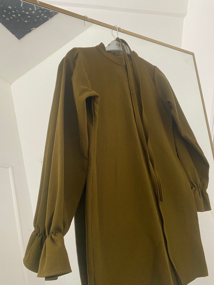 Uzun haki tunik ve boğazlı yakalıdır. Uzun kollu, rahat kesim ve desensiz dokusuyla günlük sokak modasına uygundur.