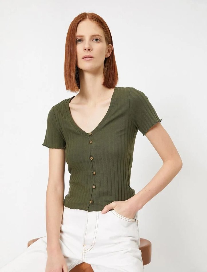 Haki V Yaka Düğmeli Kısa Kollu Kadın Bluz