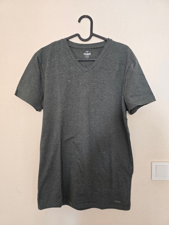 Gri renkli, V yaka ve kısa kollu erkek tişörtü. Keten kumaştan, bol kesim ve normal boyda, günlük rahat stil için uygun.