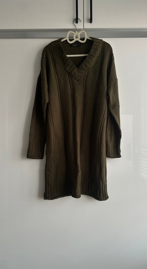 Haki, V yakalı ve uzun kollu triko kazak, rahat ve gevşek kesimiyle günlük kullanıma uygundur.