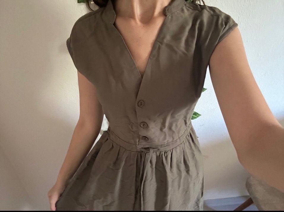 V yakalı ve düğmeli kısa kollu diz kapağımı kapatıyor Bol kesimi ve bohem tarzıyla rahat bir görünüm sunar. Defosu yok çok az kullanıldı etiketinde 34 yazıyor ama 38 için uygun