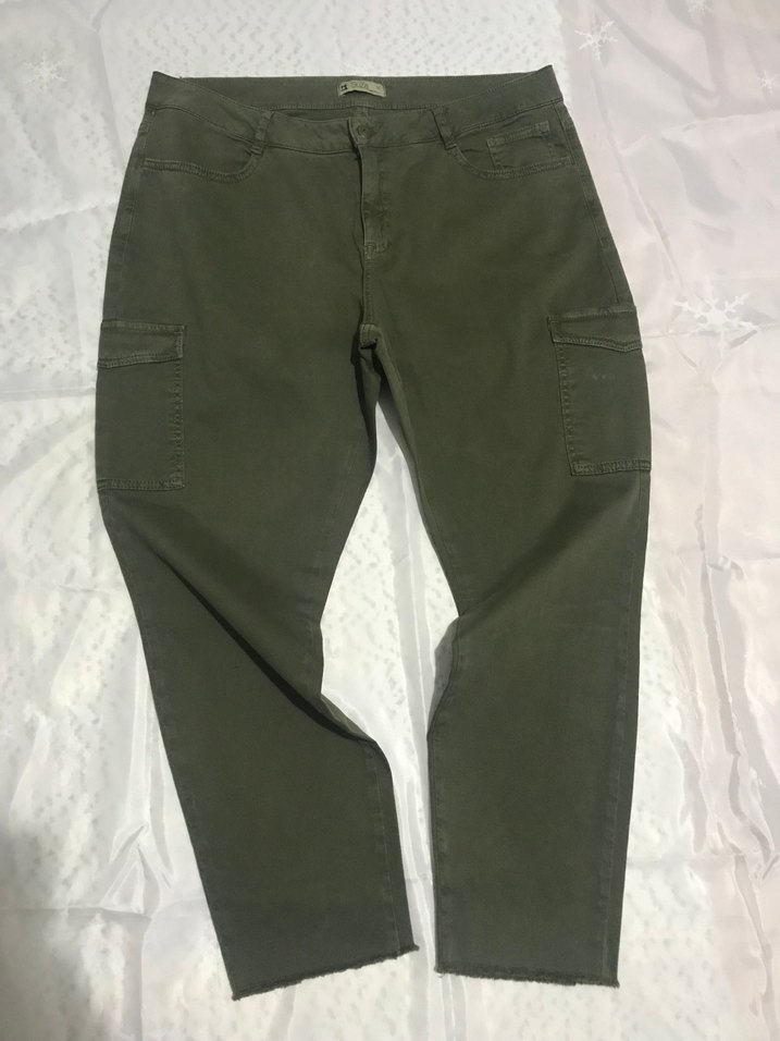 rahat kesim haki kumaş pantolon. Midi boyda, çoklu ceplerle outdoor kullanıma uygun, pamuklu kumaştan üretilmiştir. Boy:97cm.İçerik:%97 pamuk %3 likra.Yan cepler dikili kullanılmaz.Sıfır ürün.Üst duruşu gösteremiyorum