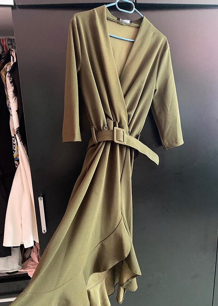 Haki yeşil elbise önden asimetrik yırtmaç detaylı bir kez giyildi.s m beden uyumlu