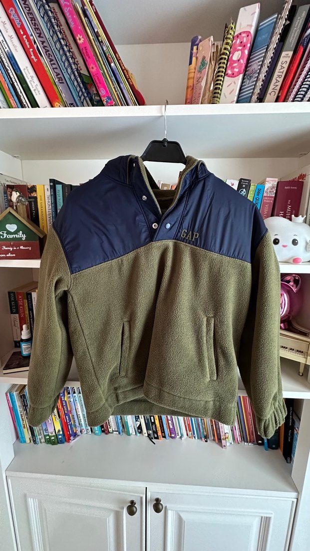 Erkek çocuklar için düğmeli, yüksek yakalı, bol kesim haki yeşil ceket. Yumuşak ve sıcak polar kumaştan üretilmiş, sade tasarım, rahat sokak stili için uygun.