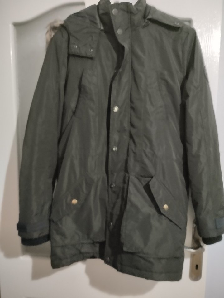 haki yesil renkli erkek parka, fermuarlı düğmeli kapama ve kesik yaka ile, uzun kollu ve regular kesimdir. Sentetik kumaştan üretilmiştir, dış mekan kullanımı için uygundur. ☔ fotoğraflarda belirttiğim birkaç terzilik işi var o yüzden fiyatı düşük tutuyorum sökukler dışında yeni gibi