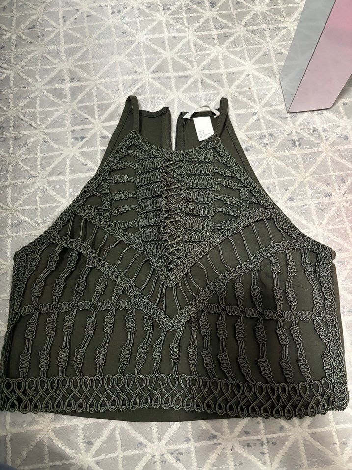 Haki yeşil , dantelli ve nakışlı desenlere sahip yüksek yakalı, kolsuz, kısa kesim crop top. Sentetik kumaştan, gotik ve avant-garde tarzlara uygun. H&M markasına aittir
