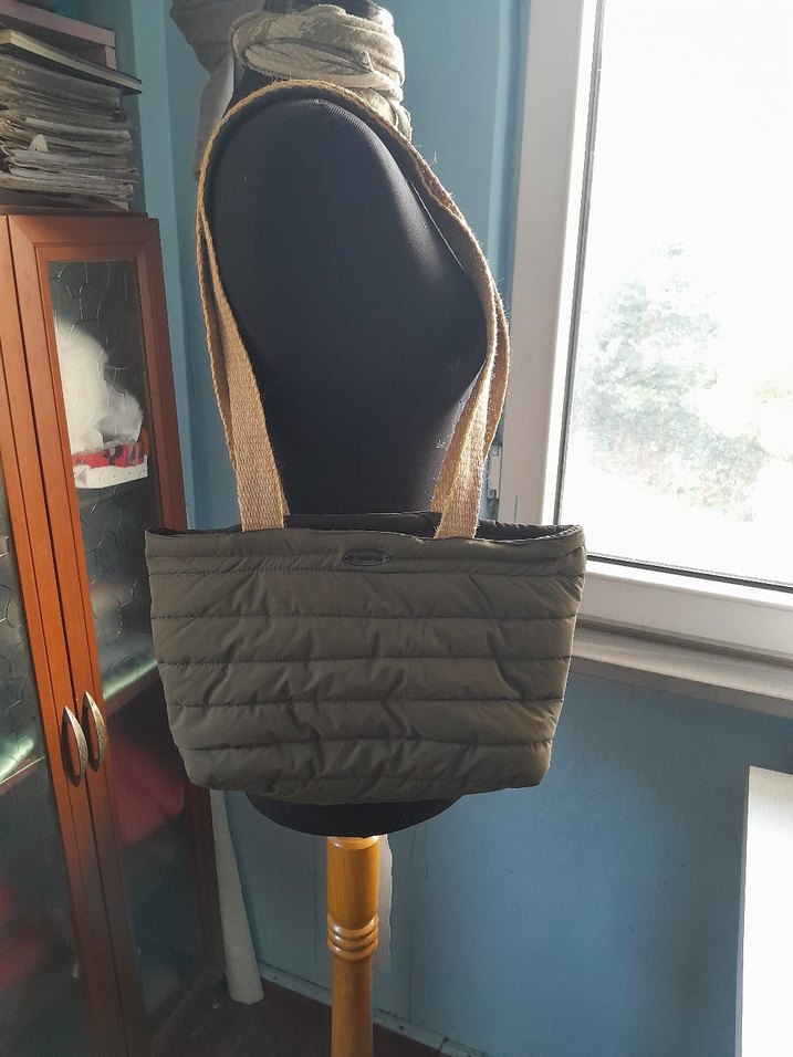 haki yesil renkte, şişme mont kumaştan yapılmış, günlük kadın omuz çantası. Sokak stili ve gündelik kullanıma uygun sade desensiz model. ici astarli cepli