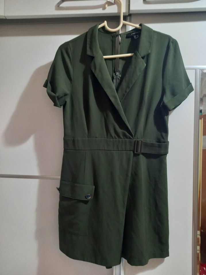 Haki yeşil kısa tulum, kesik yaka, kısa kollu ve kemerli bel detayına sahip. Normal kesim ve midi boyda, ofis ve gündelik şıklık için uygun. Sentetik kumaştan üretilmiştir.