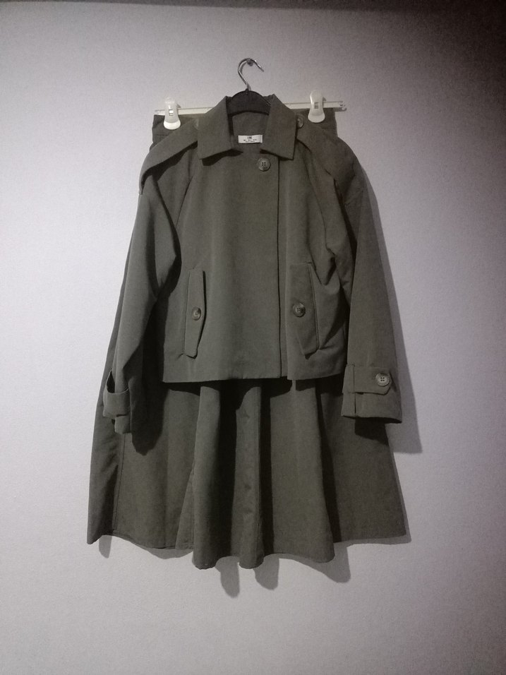 haki yeşil kısa boylu, pileli detaylı hamile ceketi, bol kesim ve kesik yaka ile. Uzun kollu, yumuşak ve sıcak tutan kumaştan üretilmiştir, günlük kullanım için uygundur.
