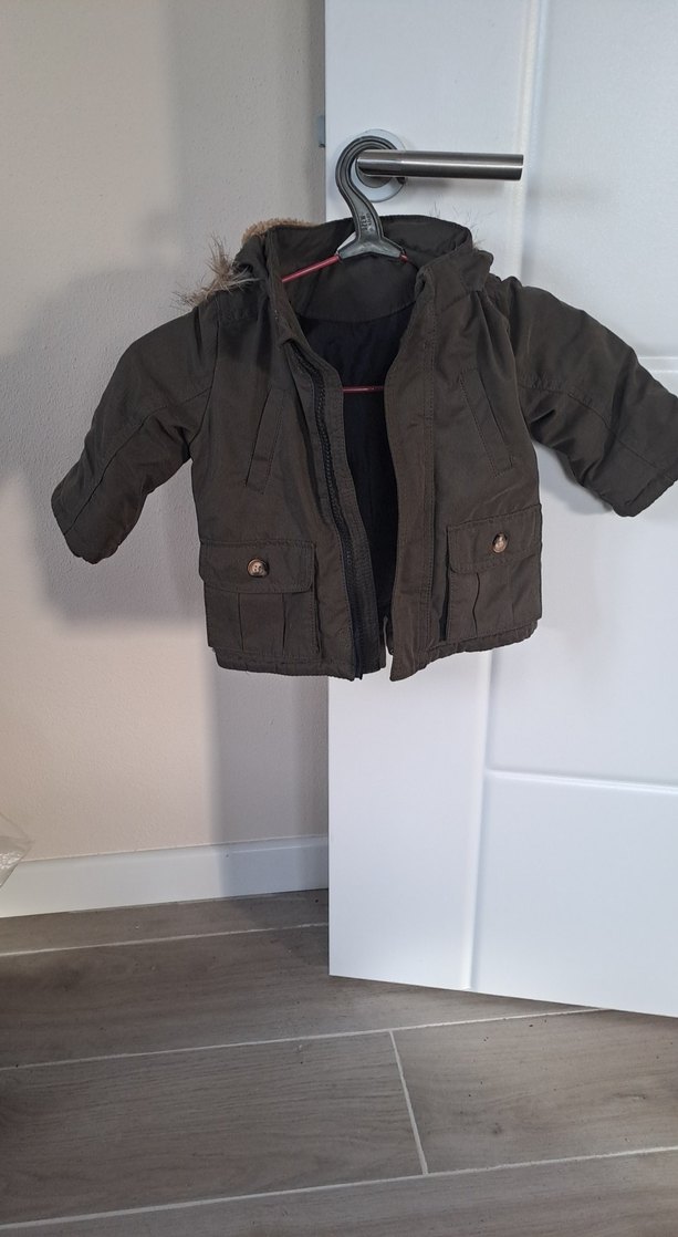 Haki yeşil, kürklü detaylı, notched lapel yakalı, soft ve sıcak kumaştan yapılmış erkek çocuk montu. Sokak stili için uygun.