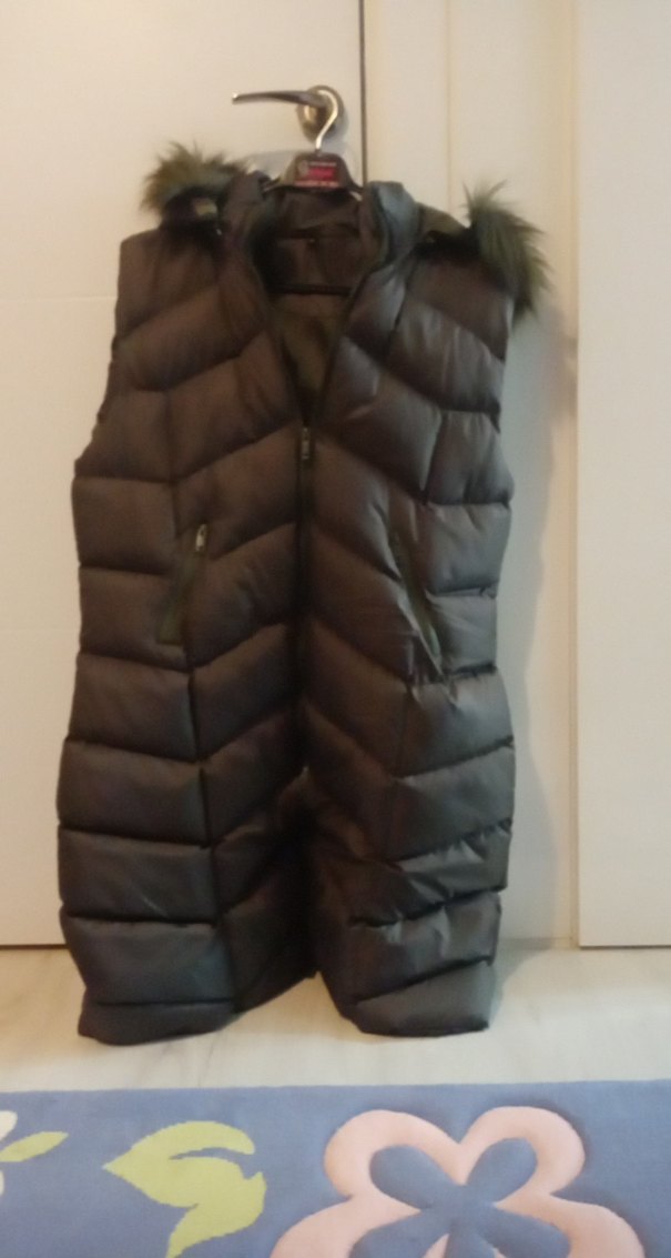 haki yeşil kürklü detaylı,uzun yelek hiç kullanılmadı