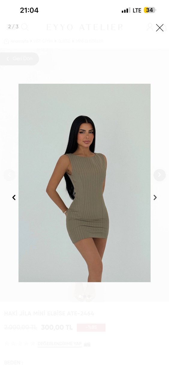 Haki renk, kolsuz tasarıma sahip bu fitted mini elbise, günlük kullanıma uygun rahat ve şık bir sokak stili sunar. Desensiz ve modern görünümlüdür. Bir kere giydim daha sonra kilo alma sürecine girdim bana olmuyo