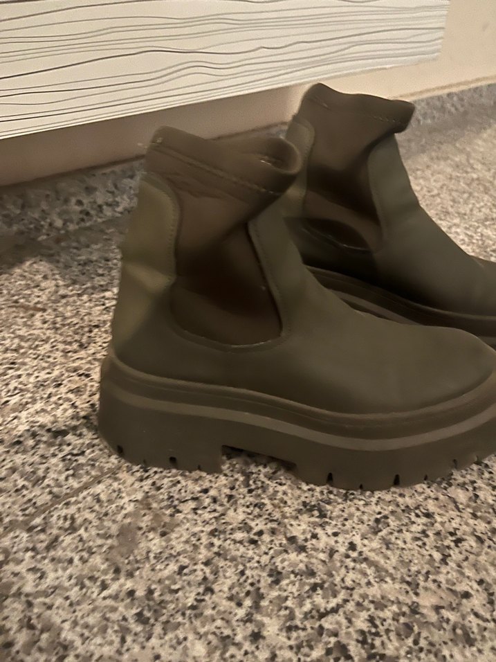 Haki yeşil, lastik platform topuklu kadın bot, günlük sokak stili için tokalı tasarıma sahip.