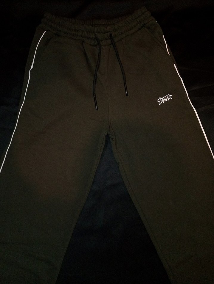 haki yeşil, bol kesim erkek eşofman altı, cepler ve beyaz yan çizgilerle. Ayarlanabilir bel ve yumuşak, sıcak kumaş spor ve günlük kullanıma uygun.