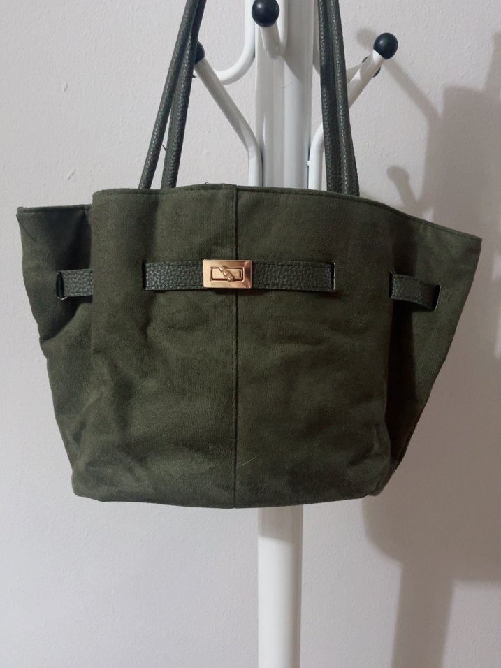 Haki Yeşil süet kadın çantası, toka detaylı ve baskılı desene sahip, trend sokak stili için uygundur.