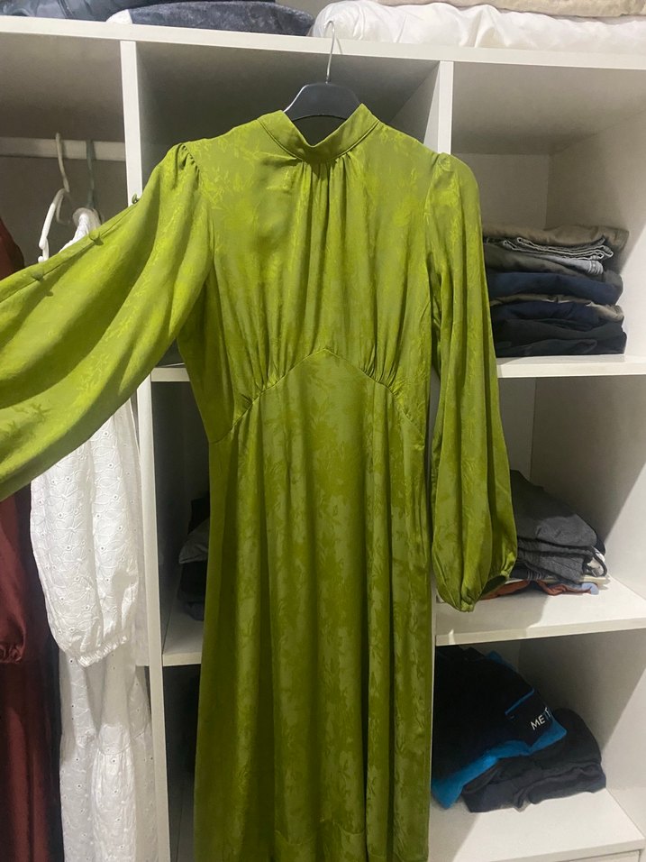 haki yeşili tesettüre uygun 34 beden etiketli hiç giymedim iade süresi dolduğu için iade edemiyorum jakarlı kumaş (kendinden desenli) yaz için de çok uygun yumuşacık kumaşı var