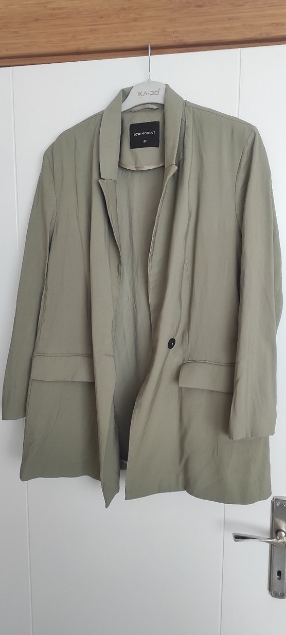 Keten kumaştan, uzun kollu, düğmeli ve klasik yaka detaylı, midi boy kadın blazer ceket. Ofis için,özel günler için uygun, sade ve şık tarzda.