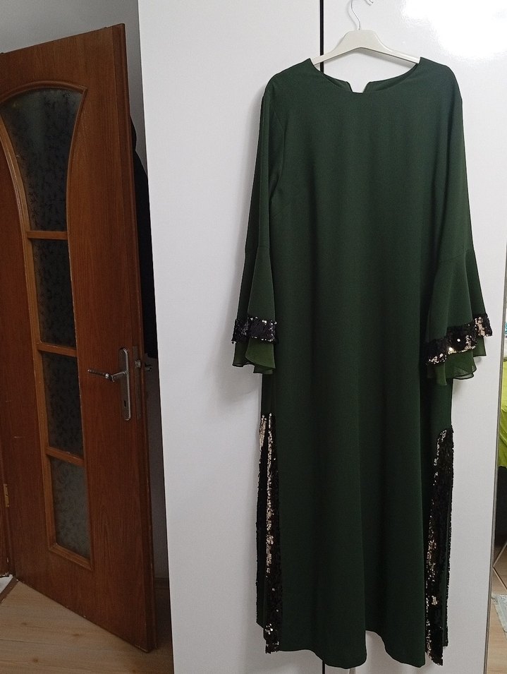 Yeşil renkli, bol kesim, drapeli uzun kollu elbise. Kollar ve yanlarda nakış detayları bulunur. Yuvarlak yaka ve parlak dokulu, bohem tarzda. elbisenin kol ve bacak kısımlarında pul detayları var çok sade ve zarif bir elbise tam kalıp 50 beden rahatlıkla içine girebilir rengi haki yeşildir hepsi 2-3 defa giyildi o da birer saati