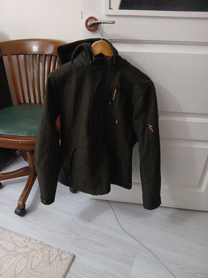 haki yeşili erkek ceketi, kruvaze yaka ve uzun kollu olup, normal ve midi boydadır. Fermuarlı cepleri ve sentetik kumaşıyla dış mekan kullanımına uygundur.
