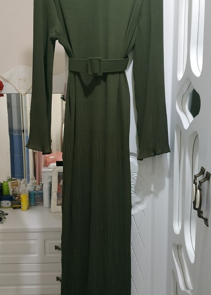 Haki yeşili kendinden piliseli elbise