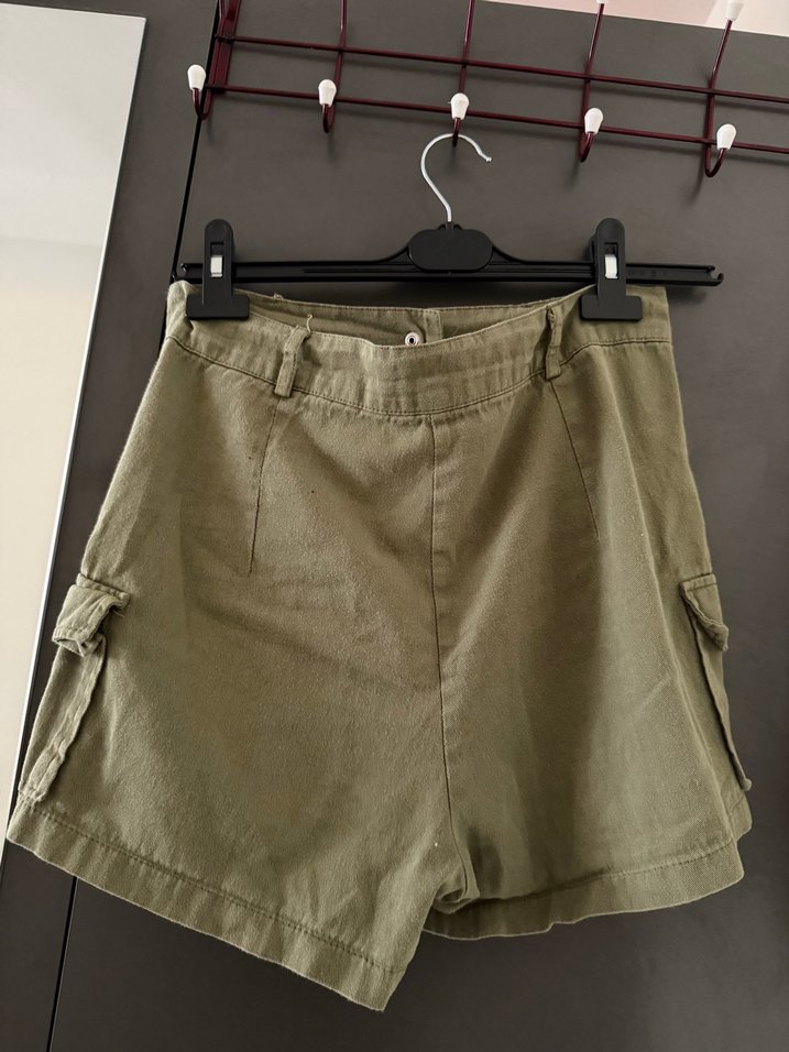 Haki yeşili keten kumaştan, kemerli ve bol kesim mini şort. Sokak stiline uygun, desen içermeyen rahat ve şık tasarım.