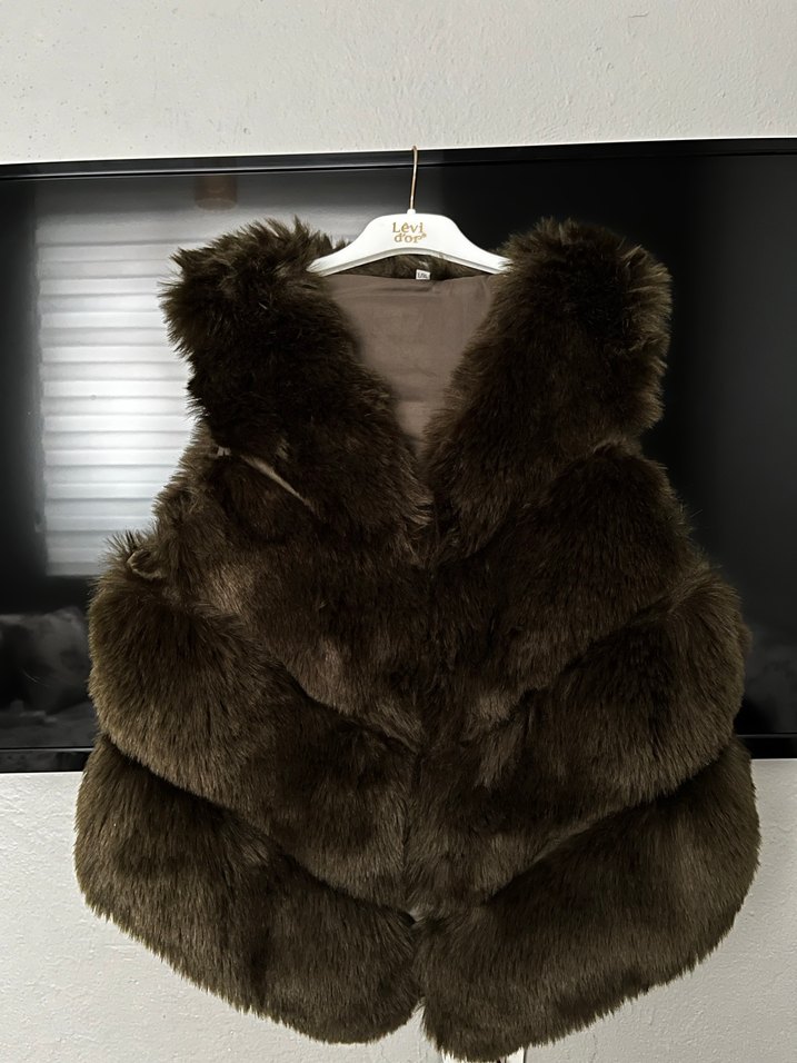 Haki yeşili kolsuz ve çok şık bir tasarıma sahip, yumuşak kürk detaylı kadın yelek. Önü normal midi uzunlukta arkası bir tık kısadır, rahat ve şık görünüme sahiptir hiç giyilmedi yurt dışından geldi çok yumuşak bir kürke sahip