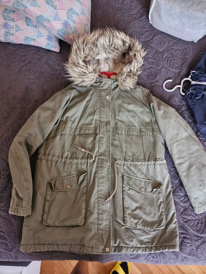 haki yesili Midi Kadın Kışlık Ceket, Kürklü Kapüşonlu H&M marka - Görsel 1