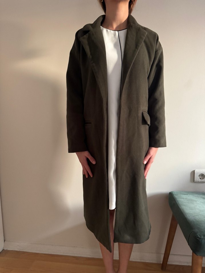 Kadınlar için uzun, süet kumaştan yapılmış kaban. Notlu yakalı ve uzun kollu, rahat kesimiyle günlük kullanıma uygun, sade ve şık görünümlü.