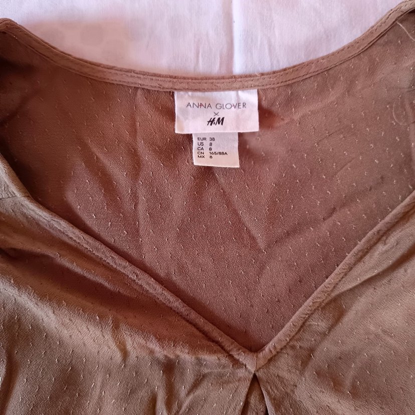 Haki renkli, V yaka ve kısa kollu keten kumaştan yapılmış ve bol kesim kadın bluz. Parlak desenli bohem tarzıyla günlük kullanıma uygundur. Bir kaç kez giyildi tertemiz