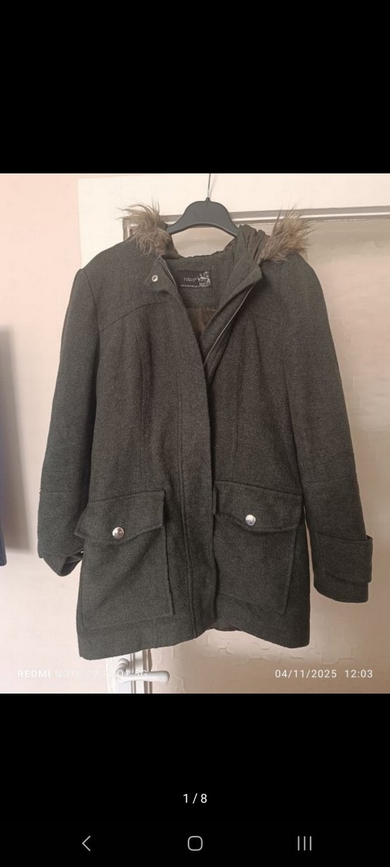 Haki yün midi kaban, kapüşonunda kürk detaylı. Uzun kollu, cepli ve notched lapel yaka ile rahat sokak stili için uygun.