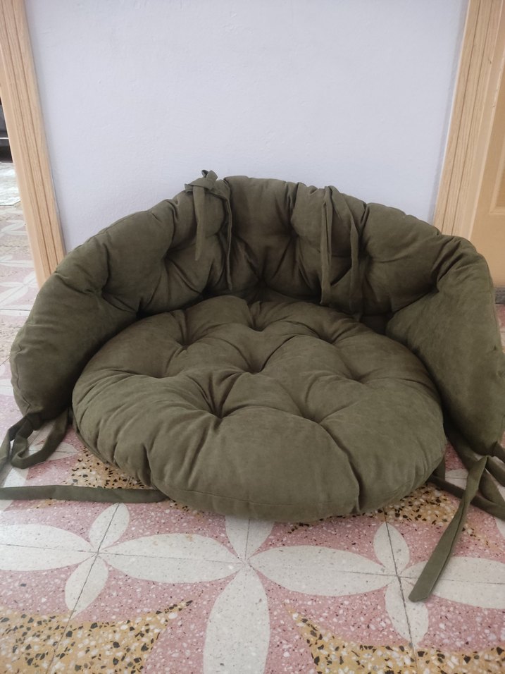 Bağlama ipli, kalın dolgulu, yuvarlak haki renk oturma minderi. ️oturak 70 cm çap sırtlık 150 cm
