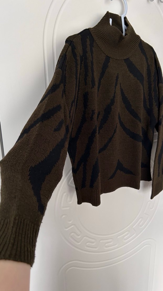 Kadınlar için koyu kahverengi zebra desenli, örme dokulu balıkçı yaka ve uzun kollu bol kesim yün kazak. Günlük kullanıma uygun rahat ve şık.