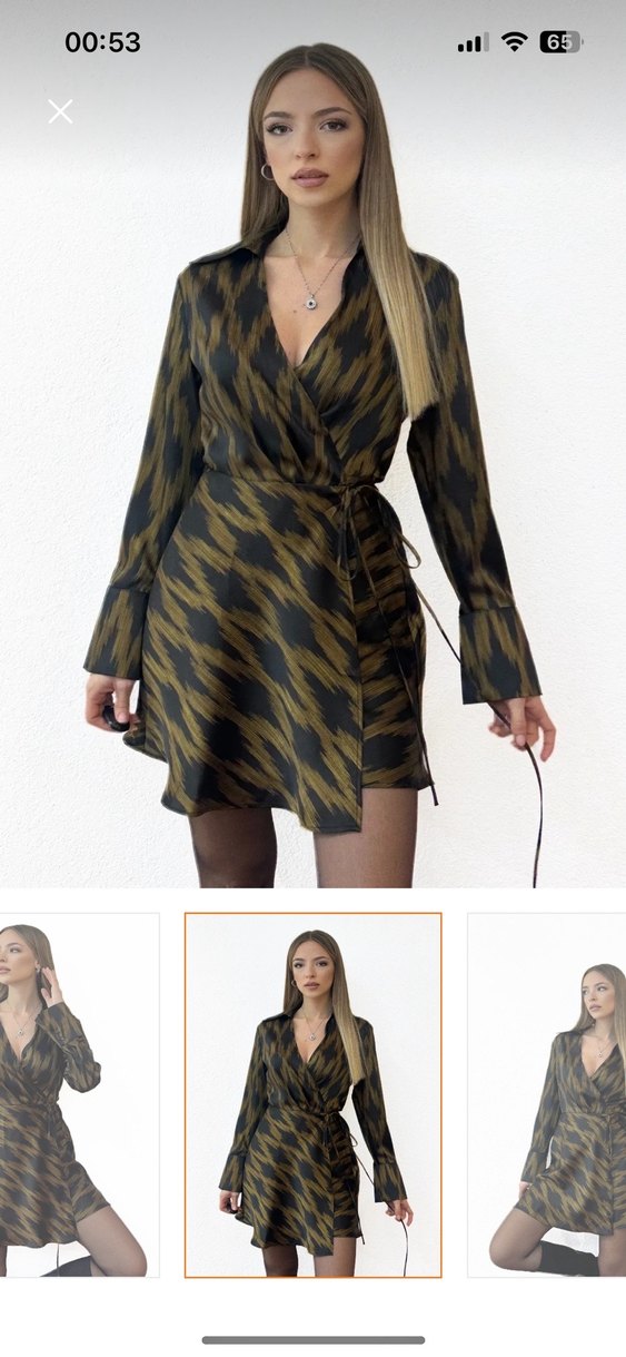 Haki zebra desenli mini elbise, V yaka ve kuşaklı bel detayı ile bol kesim sunar. Uzun kollu, suni kumaştan, günlük kullanım için uygundur.