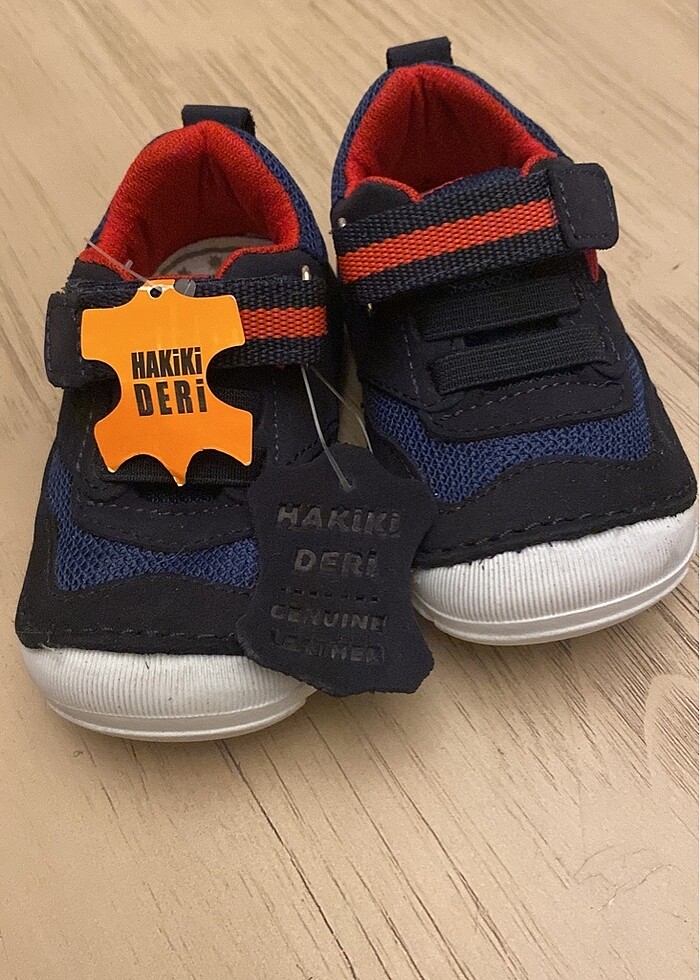 Hakiki deri 21 numara 5 nokta tabanlı etiketli ayakkabı marka temsilidir