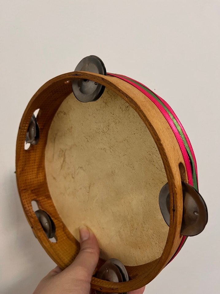Ahşap çerçeveli ve çıngıraklı renkli bir tef müzik oyuncağı. Bej renkli deri yüzeyi ve canlı pembe şeridi ile ritmik sesler çıkarır.